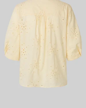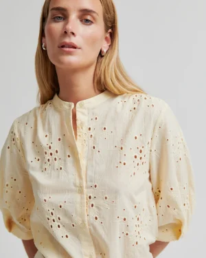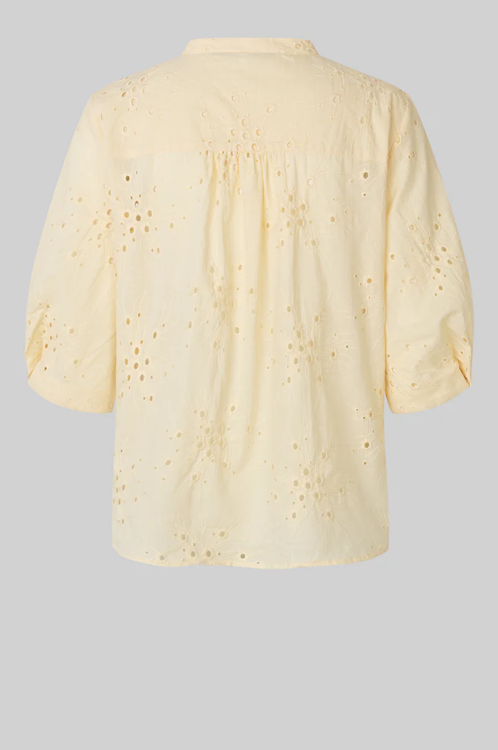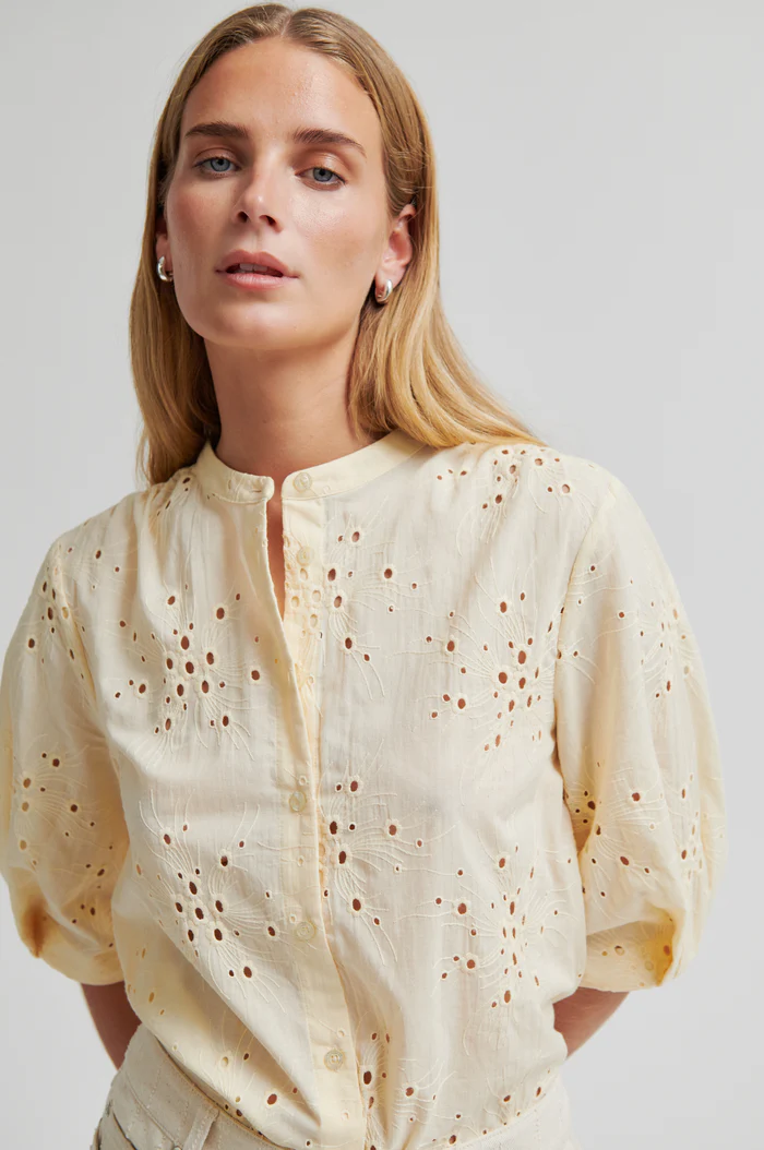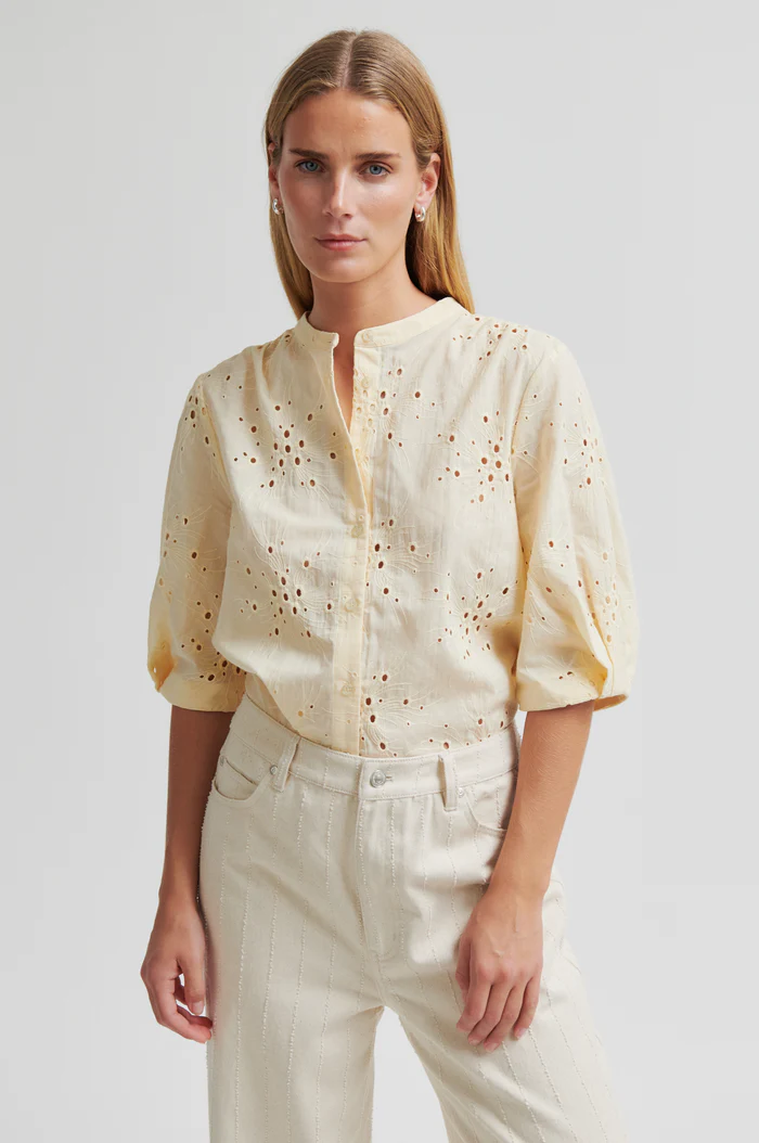 Second Female-skjorta med utskuret mönster. Skjortan är tillverkad i slät bomull med utskuret broderi. Rund krage och knäppning. Beskurna ärmar med vikt fåll och veckade detaljer. Formsydd nederkant. Normal passform.