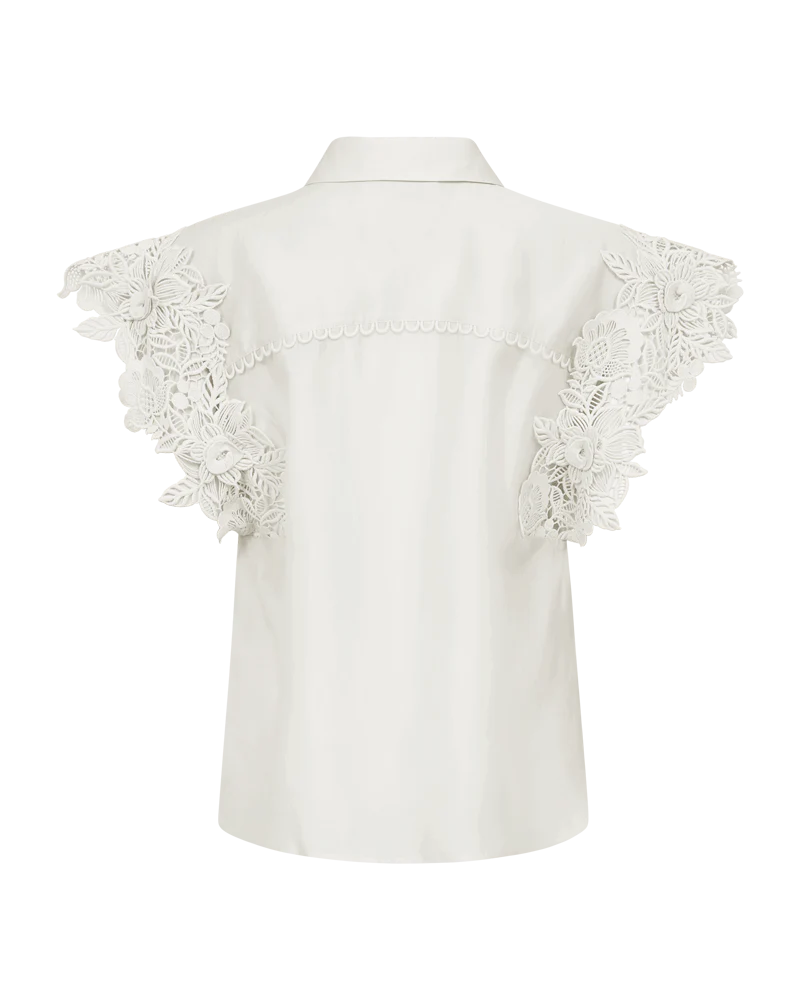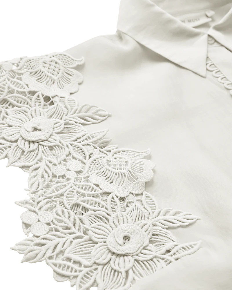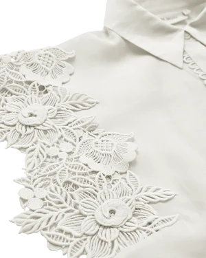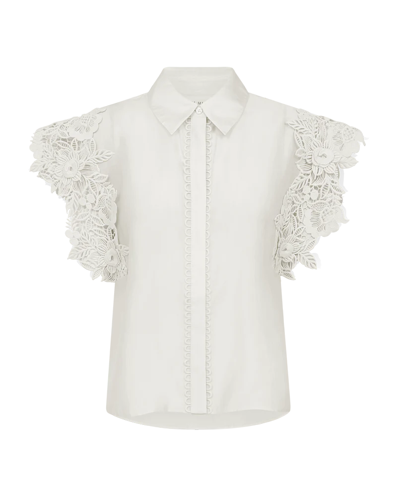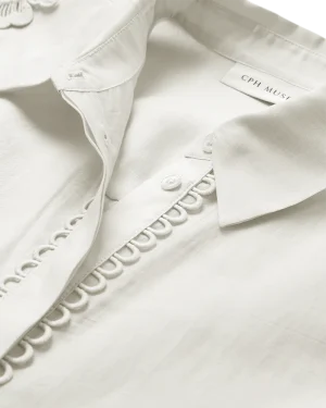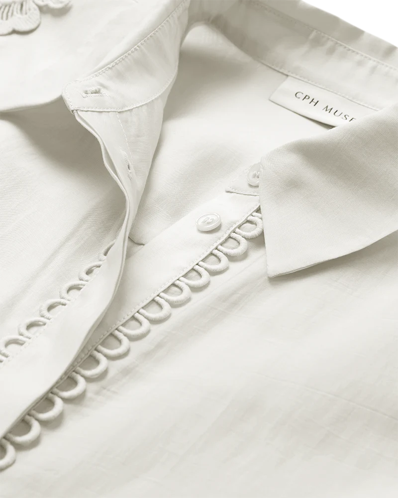 CMMOLLY-SHIRT är en skjorta i ett premiumaterial med dold knäppning och broderade kanter samt en krage med vik. Dessutom har skjortan korta ärmar med ett broderat blommönster för en feminin look.