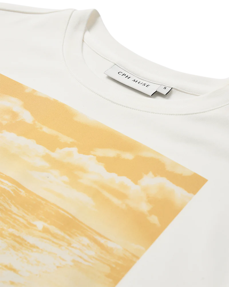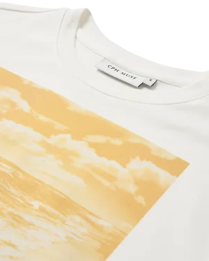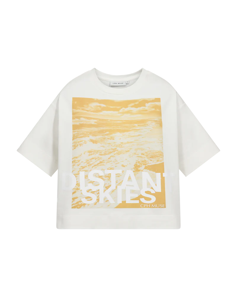 CMMUSE-TEE är en löst sittande O-ringad T-shirt tillverkad i mjuk ekologisk bomullsjersey. De breda axlarna och den avslappnade silhuetten skapar en modern look, medan en stor grafisk “Distant Skies”-konstverk framtill ger ett djärvt visuellt uttryck. Ett avslappnat plagg med ett starkt grafiskt uttryck.