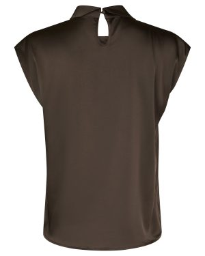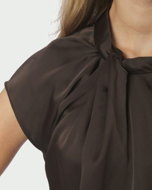Drapy feminin blus med korta ärmar i mjuk satin. Blusen har en fin knutdetalj i halsen. Blusen är löst sittande, men ändå feminin, och kan kläs upp eller ner beroende på tillfället.