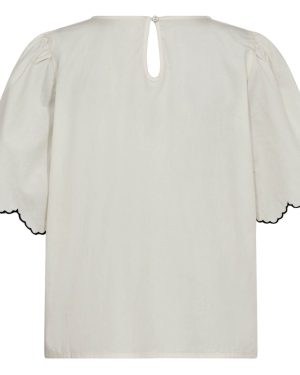 De söta broderade kantdetaljerna på både ärmarna och halsringen ger blusen en elegant och fulländad look. Ärmarna har en lätt volang och en vacker bredd, vilket säkerställer en bekväm och luftig känsla.