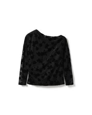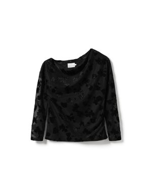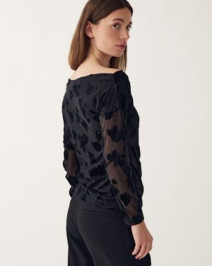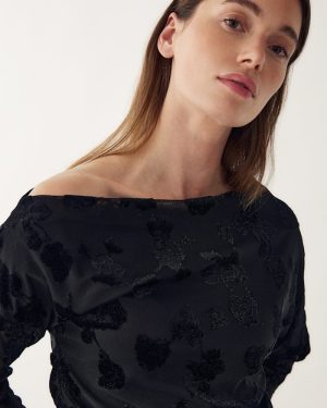 Lanna Top är en asymmetrisk topp med lång ärm, figurnära silhuett och integrerade glittrande blommor i tyget.