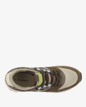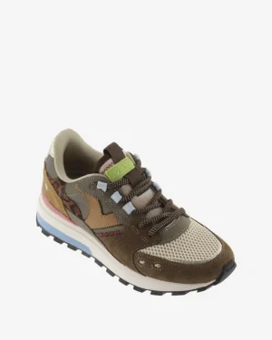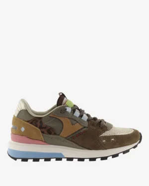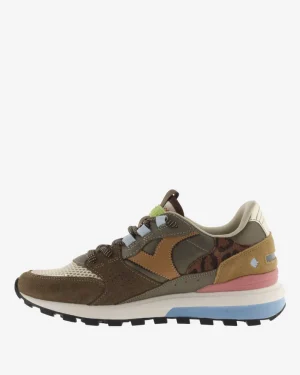 Flerfärgad sneaker tillverkad i en blandning av mocka, nylon och syntet.