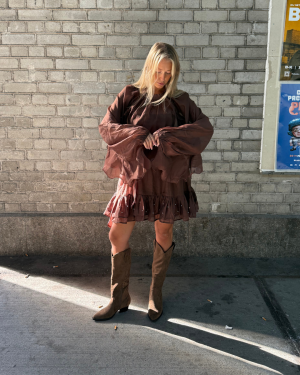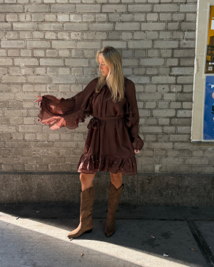 Malou Rhinestone Dress är en elegant kort klänning med vackra volanger och diskreta strassdetaljer som ger en lyxig känsla. Klänningen har en luftig passform med resår i midjan och ett knytband som framhäver figuren. De vida ärmarna och volangkanten skapar en feminin silhuett, perfekt för både vardag och fest.