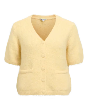 Kortärmad stickad kofta i en härlig gul färg. V-ringad hals och kort lös ärm. Rak lös passform med framfickor och klädda knappar.