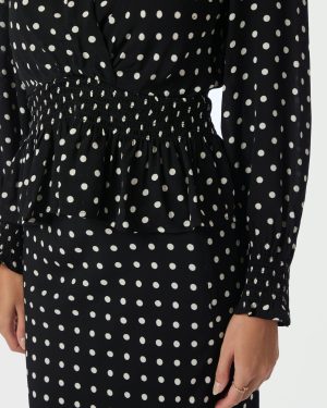 Feminint blus med små detaljer som puffärmar och elastik i midjan. Kvaliteten är en mossa crepe och har ett fint prickmönster. Modellen är 176 cm lång och bär storlek 36.
